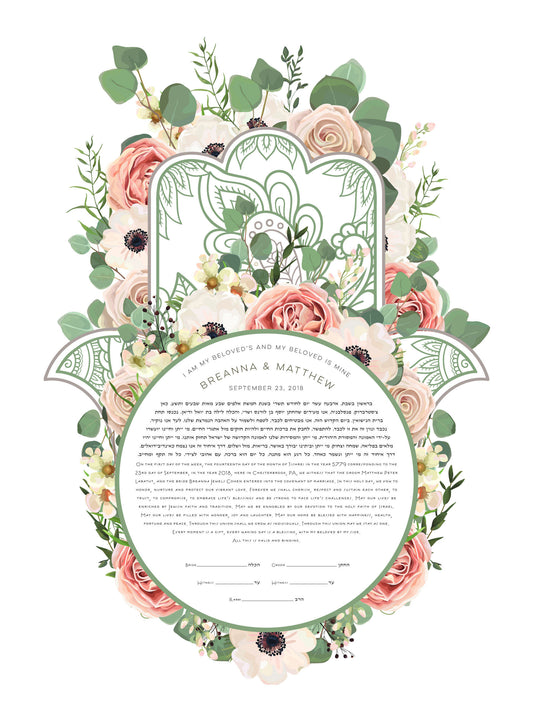 Bouquet Hamsa Ketubah - Fine Art Print for interfaith, reform and orthodox weddings