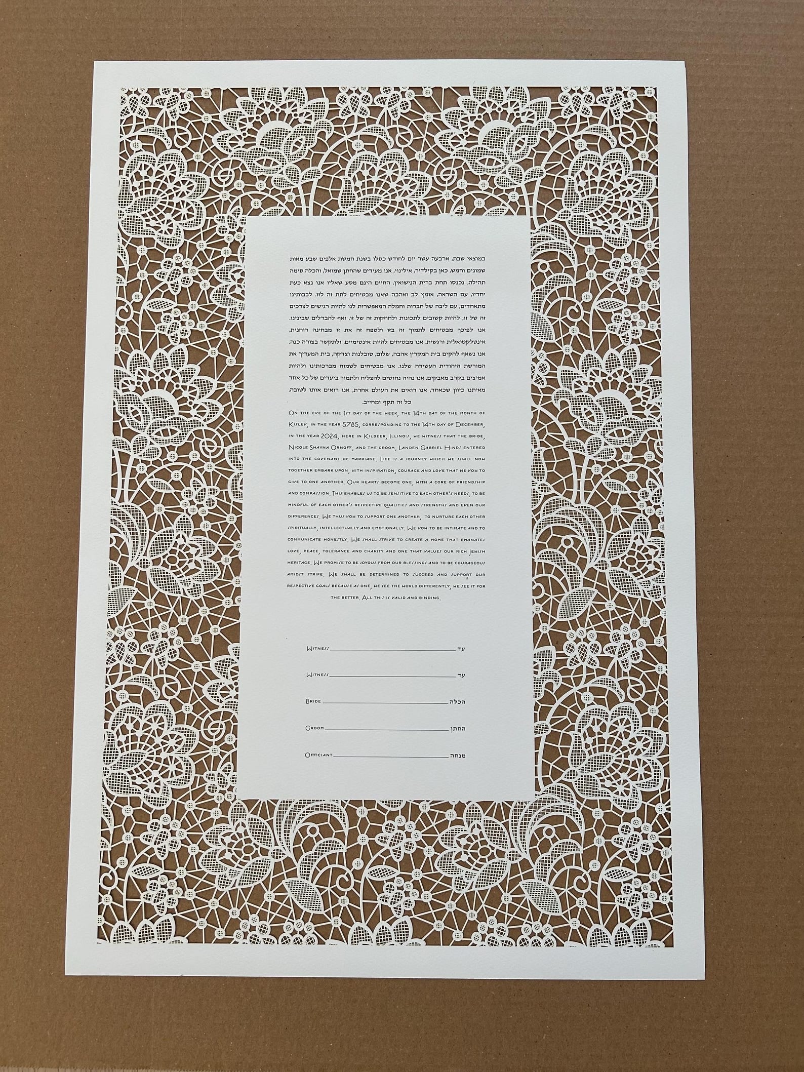 The client is responsible for proof reading the ketubah text before approving it for printing. Ketubata is not responsible for replacing approved texts, should any mistakes be found after the client has made the final approval and it has been printed.