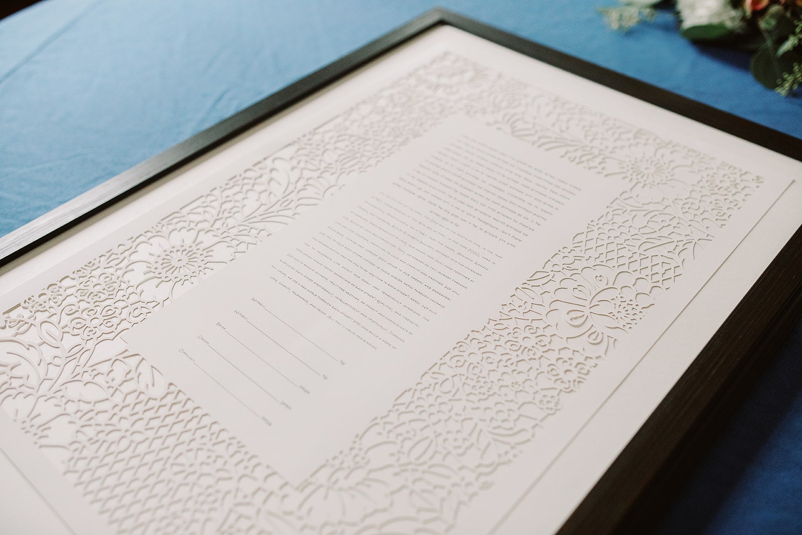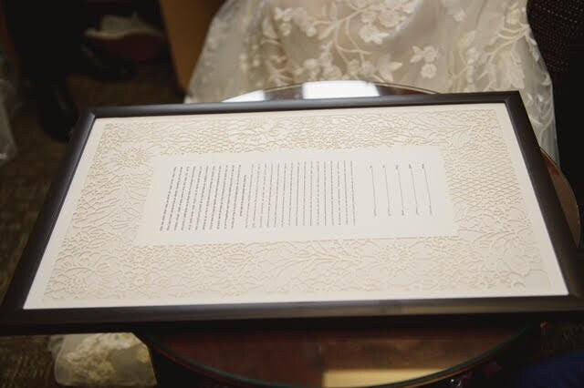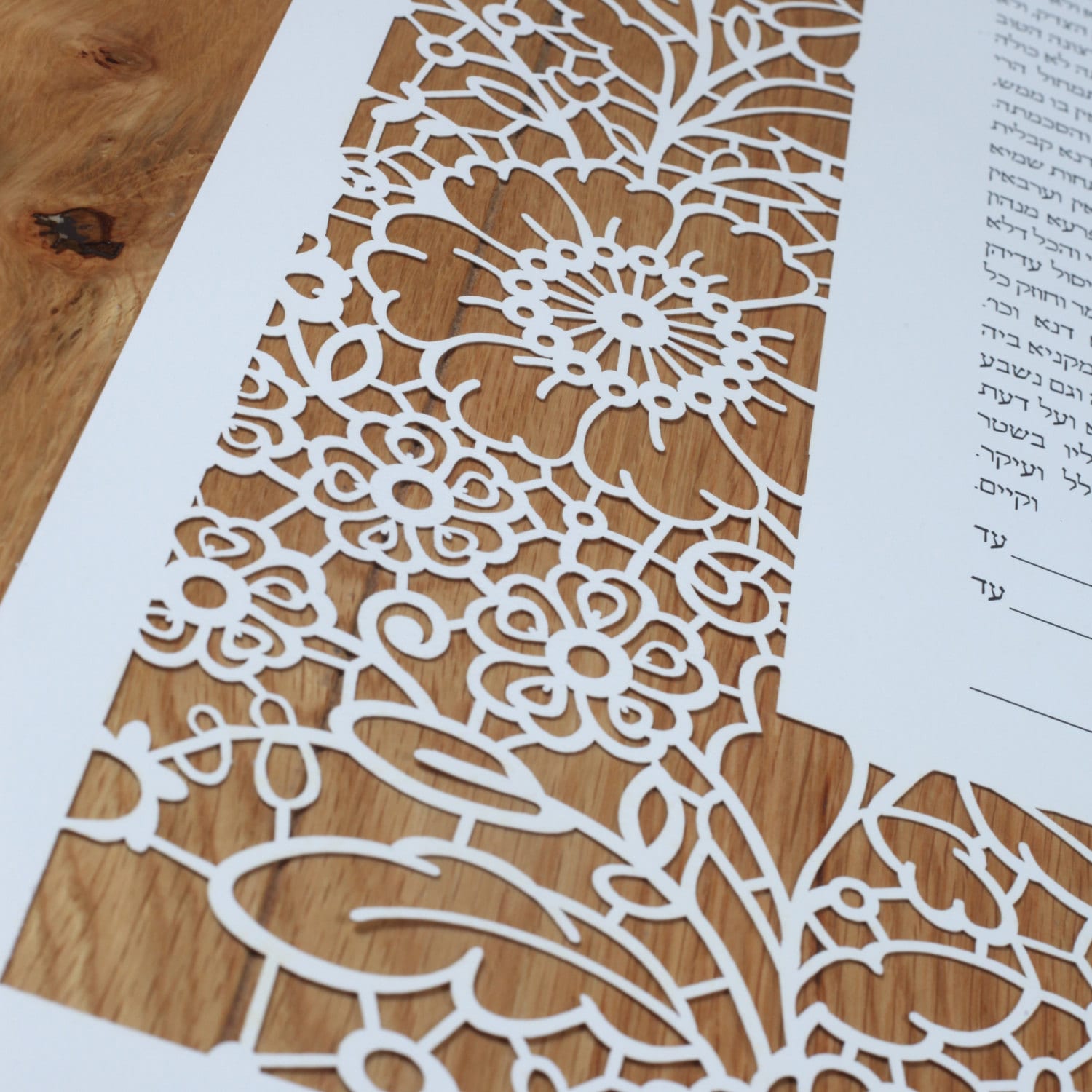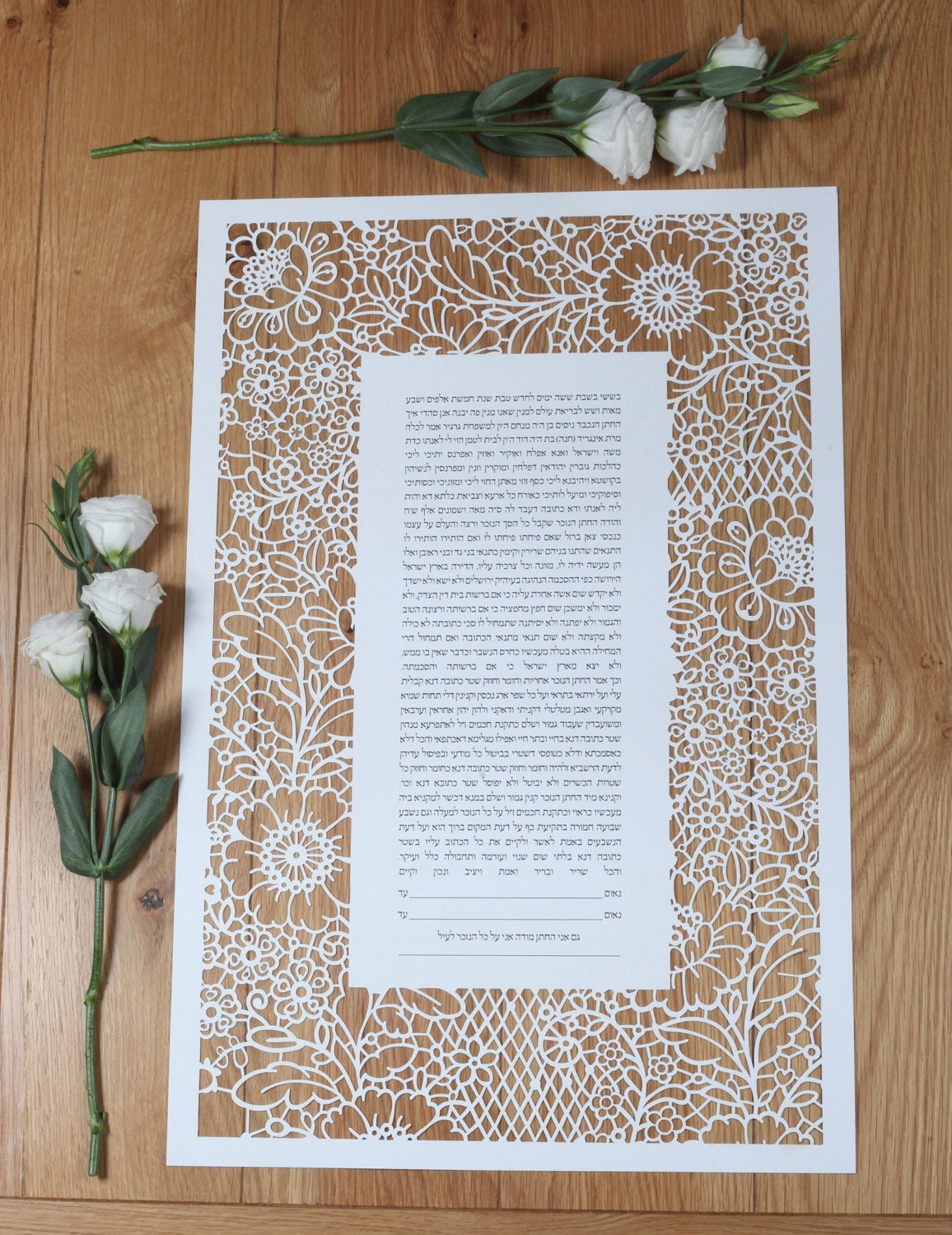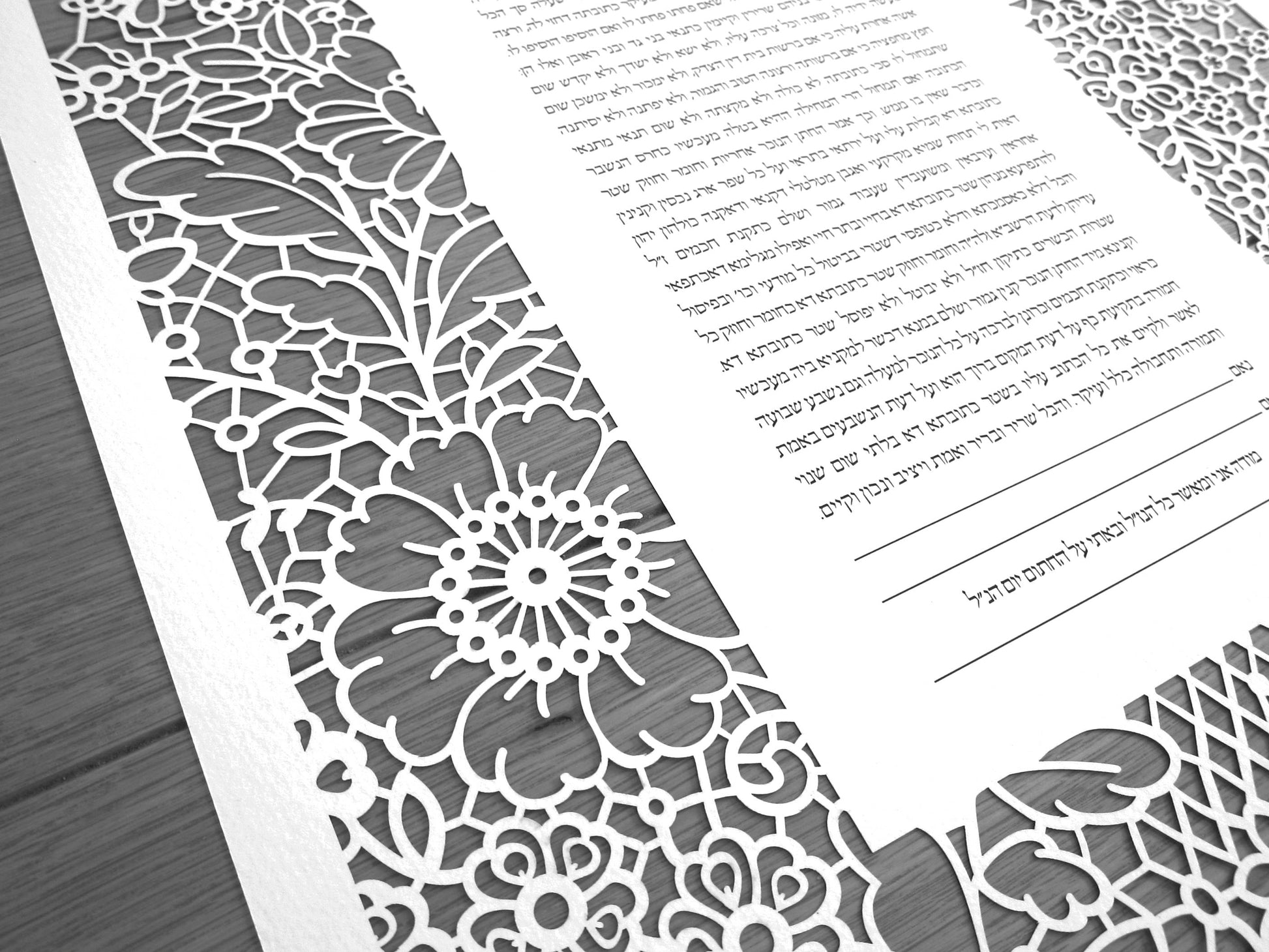 "Lace in Bloom" laser cut ketubah, including the text of your choice.