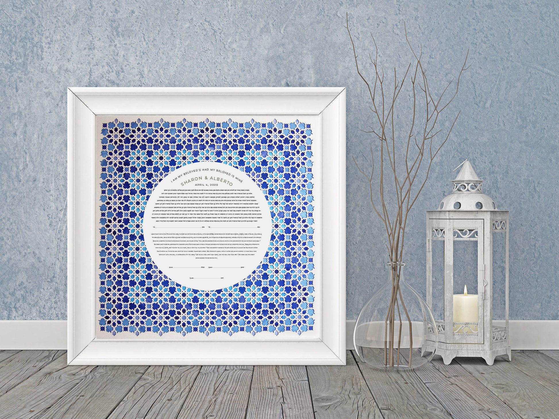 Laser Cut Mosaic Pattern Ketubah with watercolor print background. Giclée Printed onto fine art paper of the highest quality. 50x50cm approx.